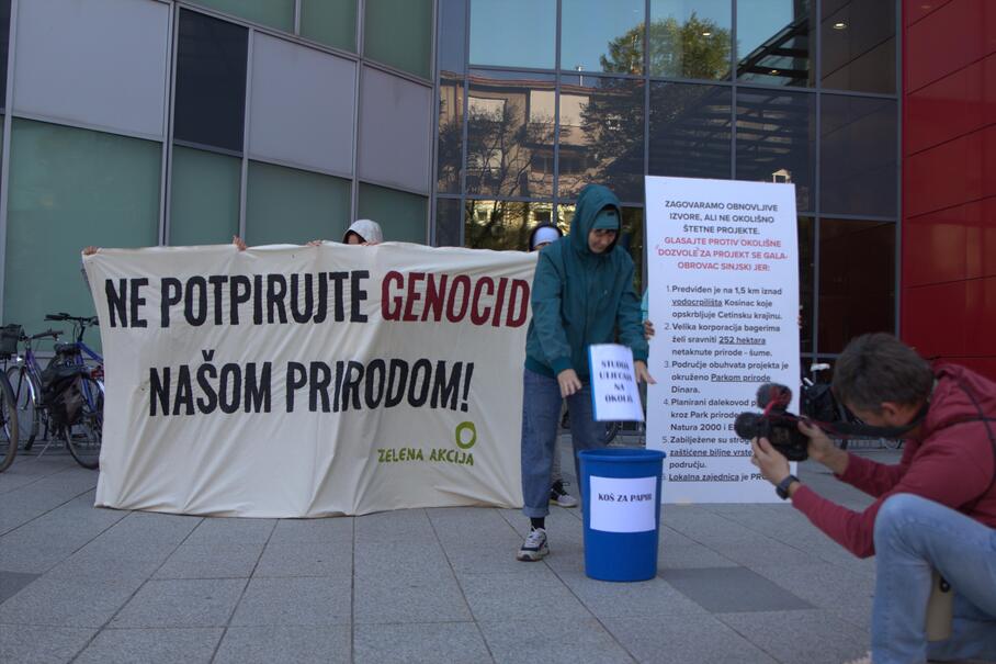 Zelena akcija upozorila je na štetnost projekta sunčane elektrane (SE) Gala–Obrovac Sinjski uoči današnje sjednice stručnog povjerenstva u postupku procjene utjecaja zahvata (projekta) na okoliš, koja se održala u Ministarstvu zaštite okoliša i zelene tranzicije. Tom su prigodom aktivisti i aktivistkinje izveli performans ispred Ministarstva, simbolično bacajući studiju utjecaja na okoliš u koš za smeće jer je smatraju manjkavom i loše pripremljenom. “Kao prvi korak, pozivamo povjerenstvo da donese negativno mišljenje o studiji. Nakon toga, očekujemo da Ministarstvo u svom rješenju taj projekt proglasi neprihvatljivim za okoliš”, poručila je Marija Mileta iz Zelene akcije.