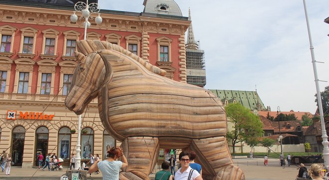 Trojanski konj visine 8 metara postavljen je danas na Trgu bana Jelačića, u znak prosvjeda protiv štetnih utjecaja Transatlanskog trgovinskog i investicijskog partnerstva (TTIP-a).