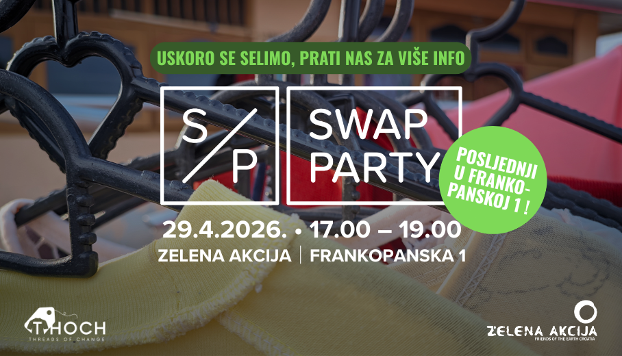 Dođite na četvrti swap party u ovoj godini - u srijedu, 29.4., od 17 do 19 sati u Zelenoj akciji (Frankopanska 1, Zagreb). Ujedno vas obavještavamo da je ovo posljednji swap party ove godine na adresi u Frankopanskoj te ćemo zbog obnove zgrade od idućeg mjeseca aktivnosti održavati u prostorijama Centra za kulturu u parku Ribnjak.